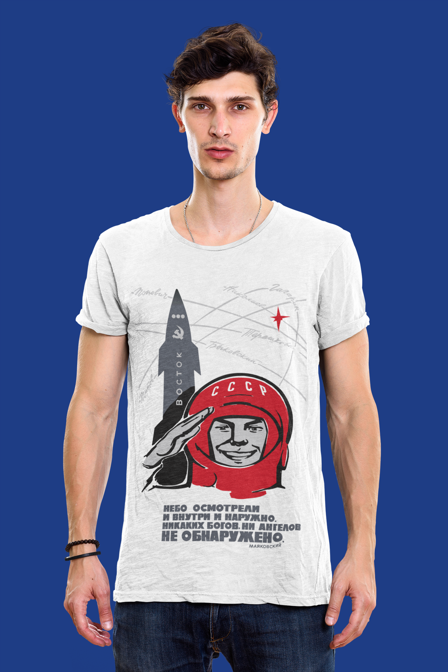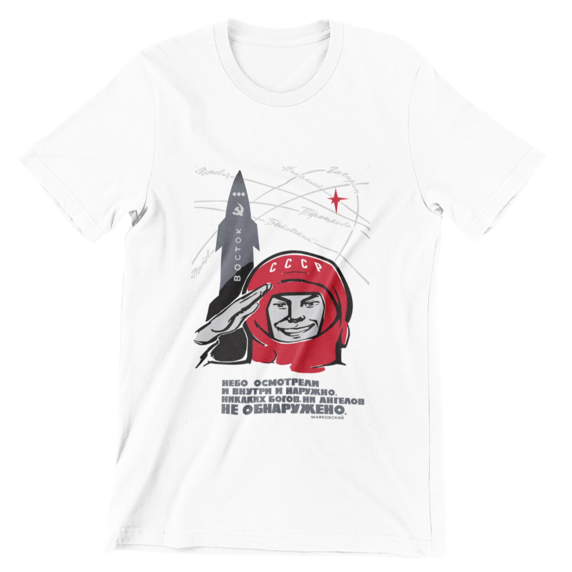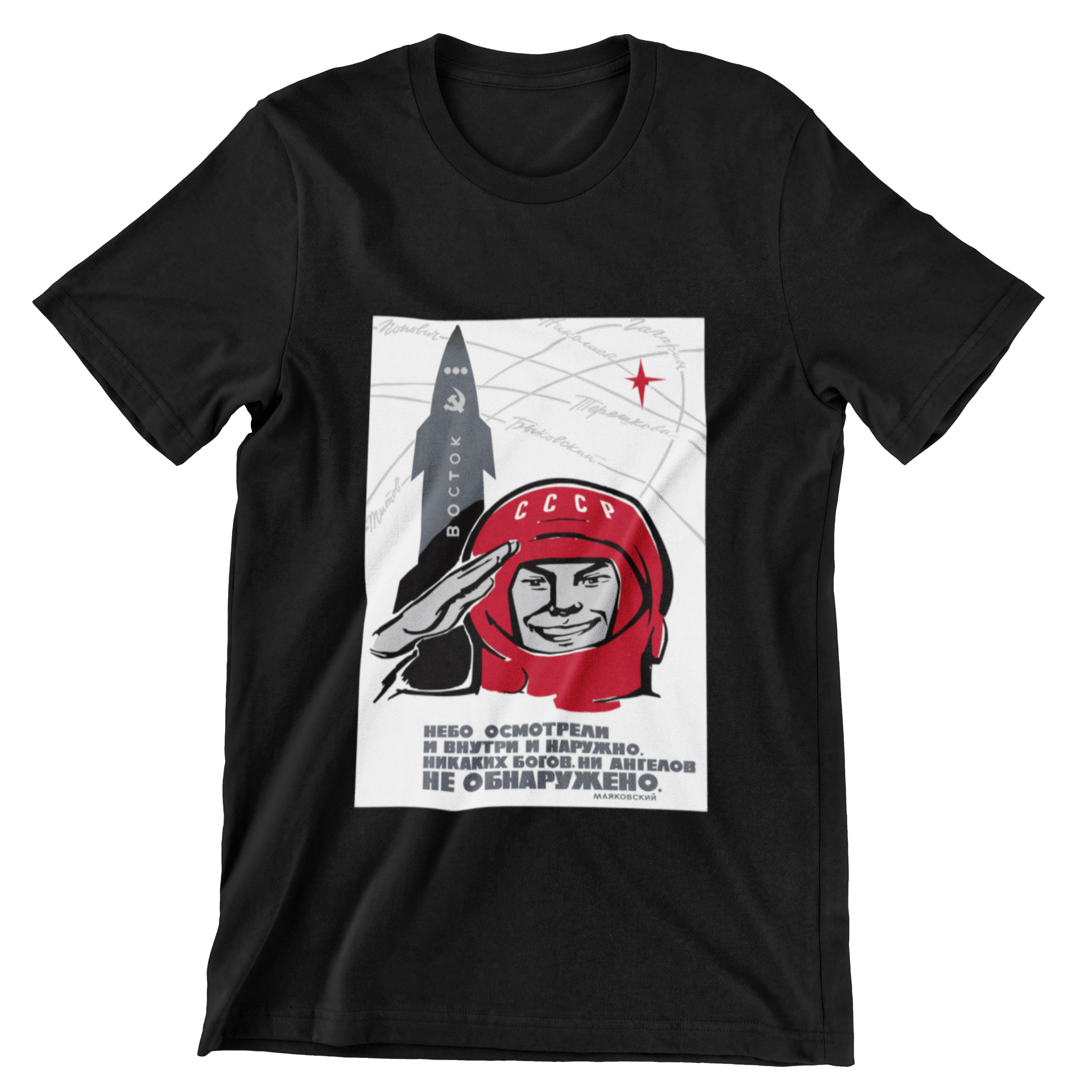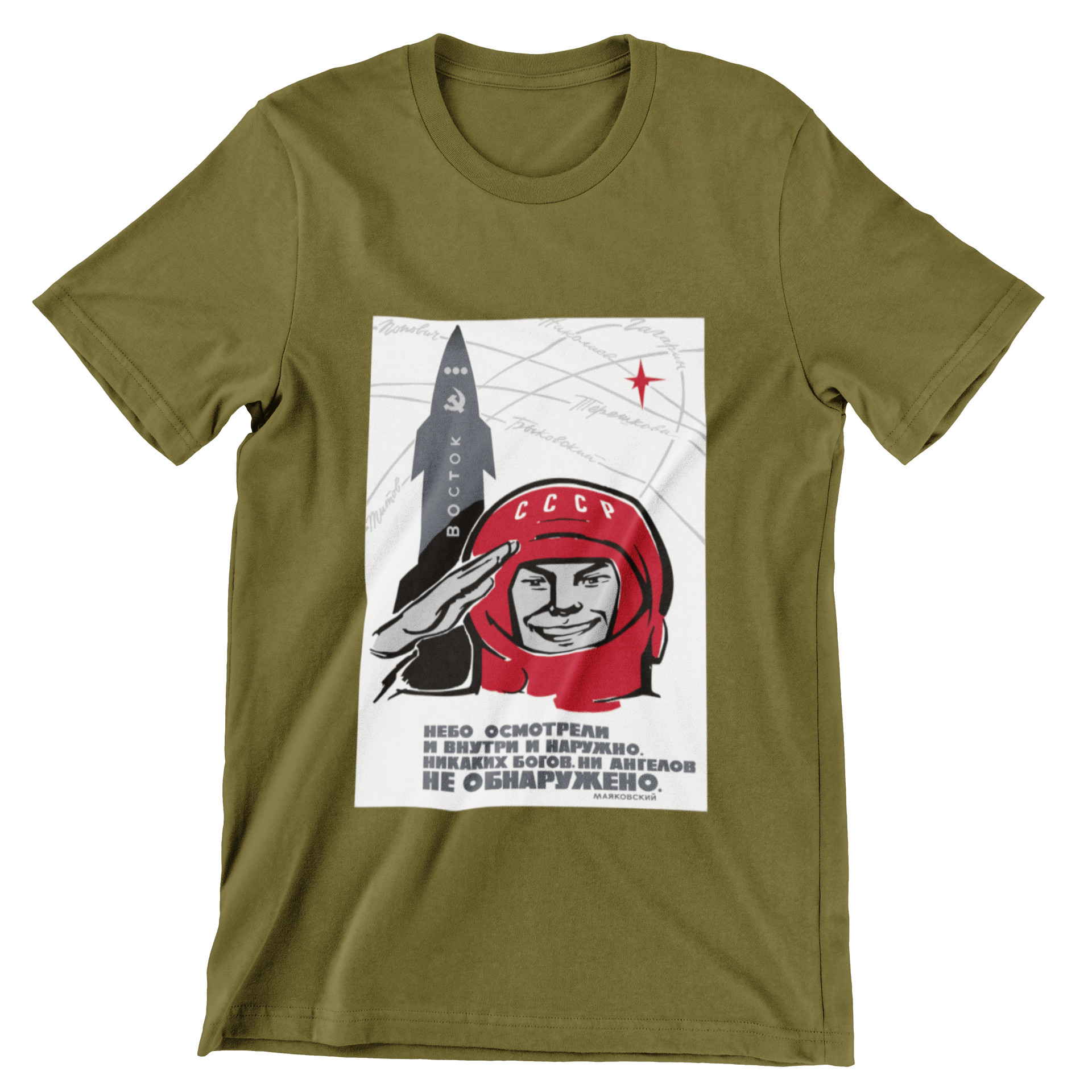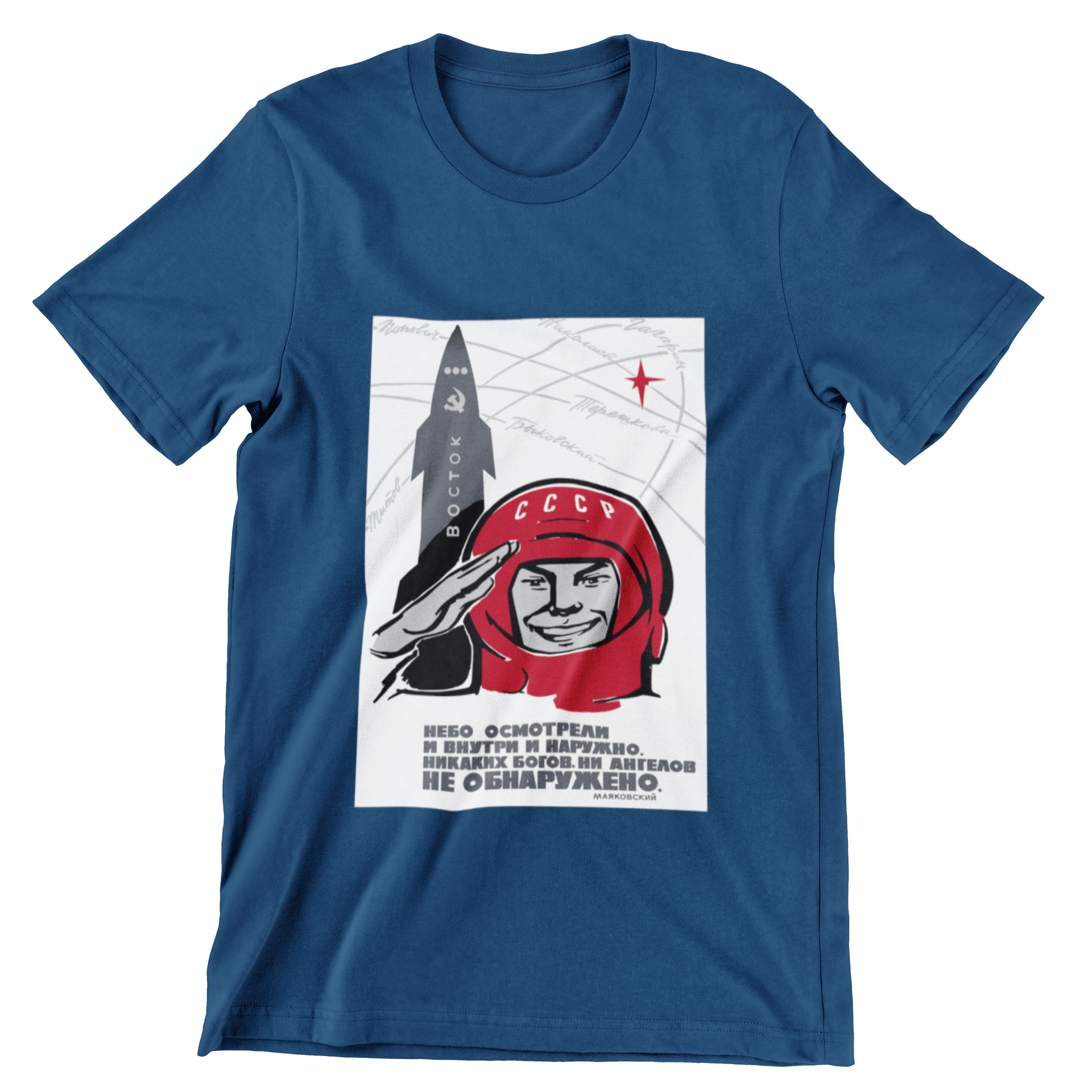 This soft and lightweight T-shirt features a Soviet anti-religion poster captioned "We've inspected the sky inside and outside. No gods or angels were found."