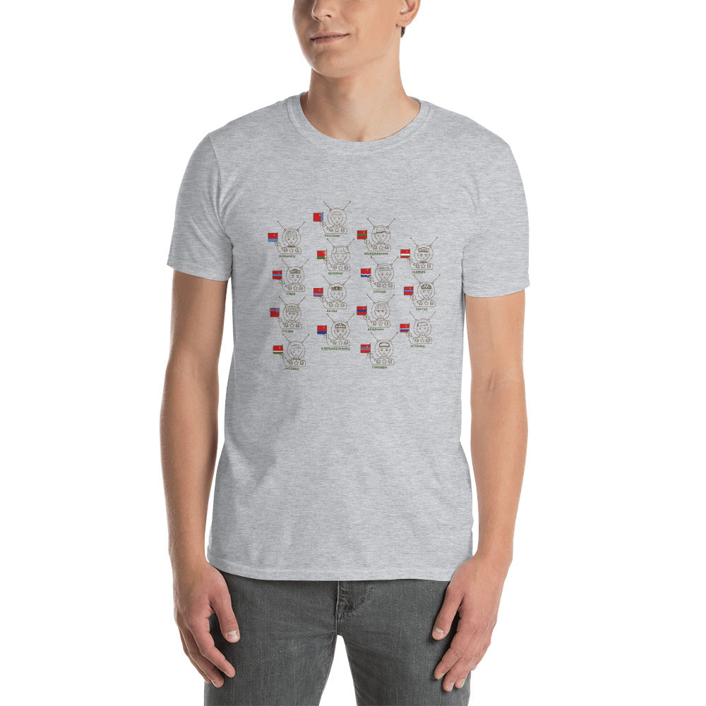 This t-shirt is inspired by an illustration from a 1960s Soviet magazine, featuring cosmonauts from each of the 15 Soviet republics at the time and their respective flags: Armenia, Azerbaijan, Belarus, Estonia, Georgia, Kazakhstan, Kyrgyzstan, Latvia, Lithuania, Moldova, Russia, Tajikistan, Turkmenistan, Ukraine, and Uzbekistan.