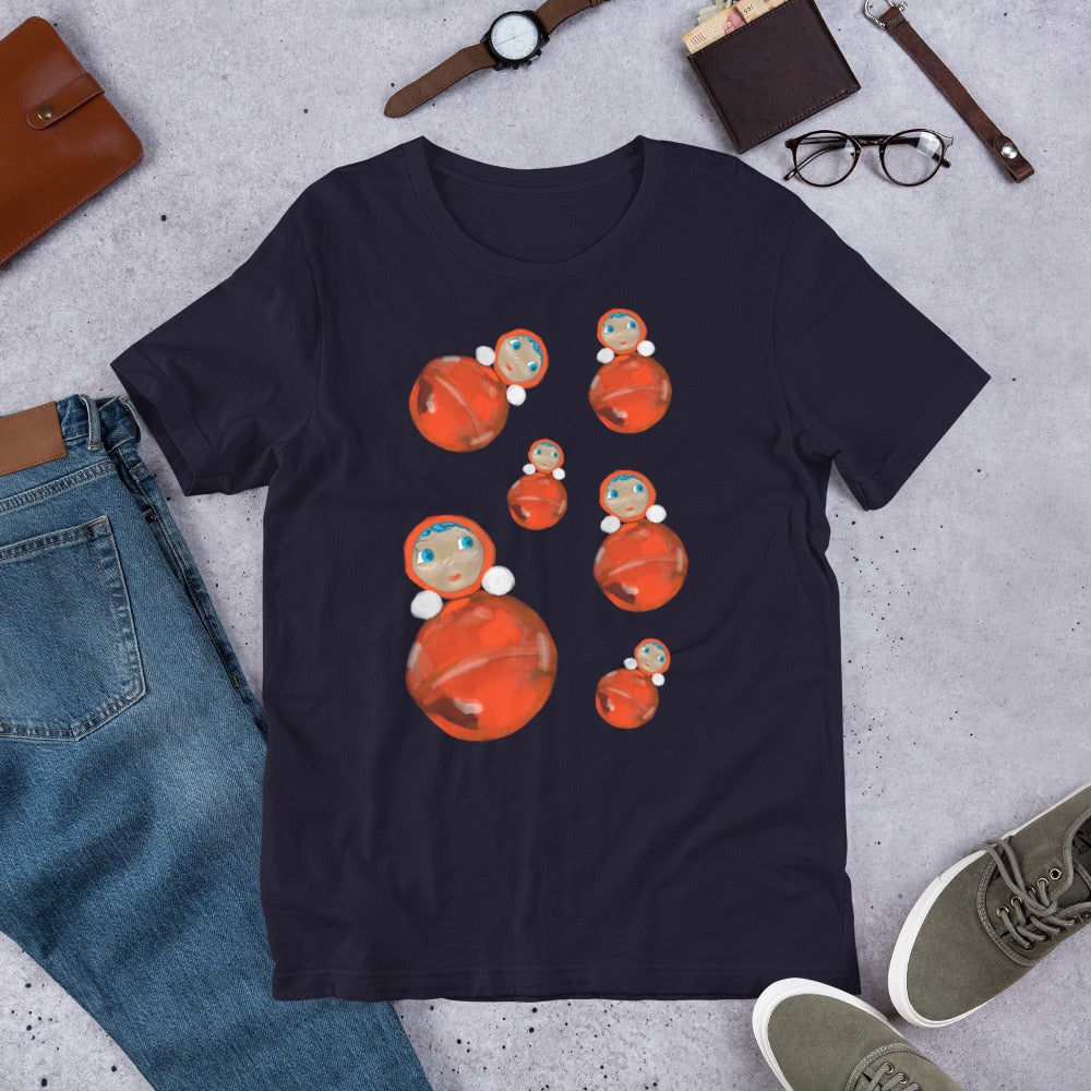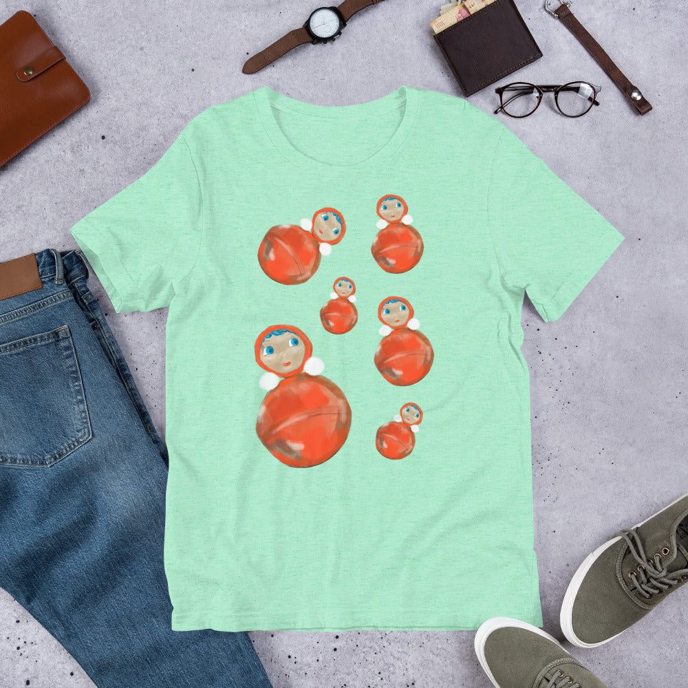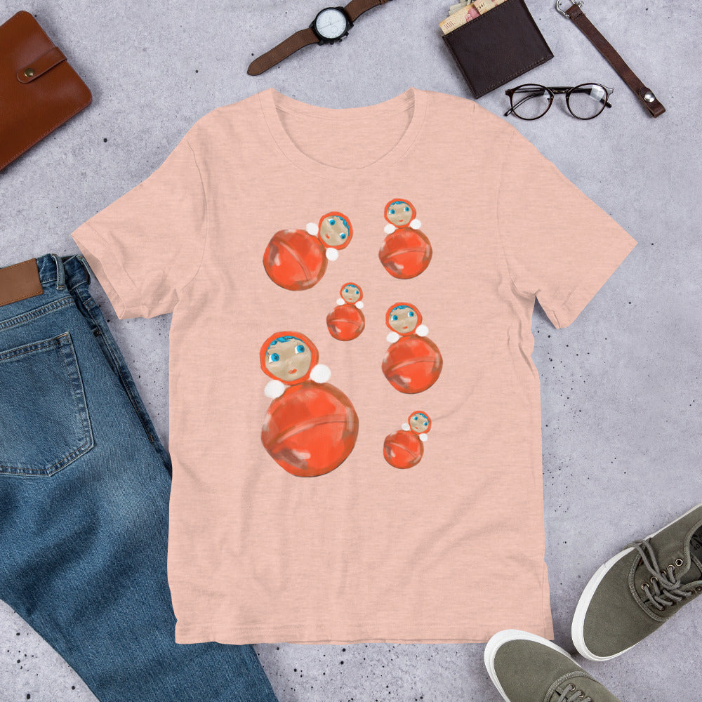 This unisex t-shirt is adorned with an illustration of several Soviet-style "nevalyashka" dolls: rounded & weighted dolls that pop back up if you try to knock them over.