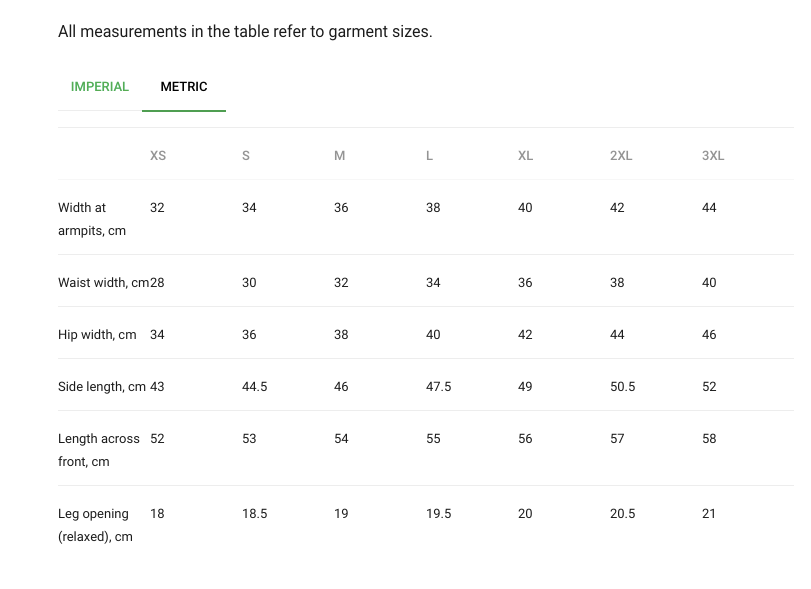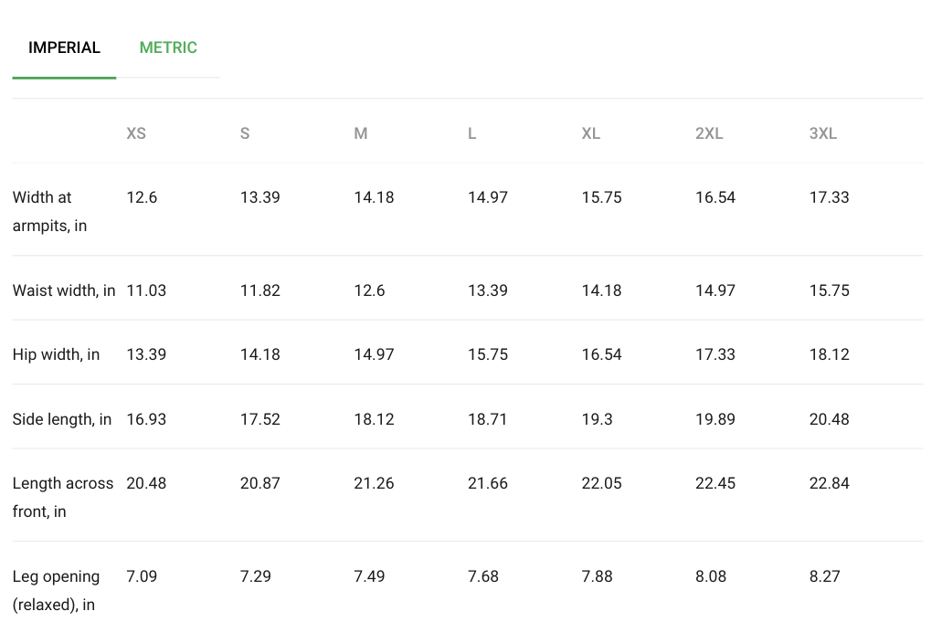 | Leg opening (relaxed), in | 7.09 | 7.29 | 7.49 | 7.68 | 7.88 | 8.08 | 8.27 |